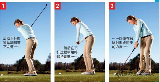 下杆时确保维持这种紧贴,这将有助于在正确的平面上挥杆,并让你利用身体的转动——不只是双臂动作——在触球时产生力度。