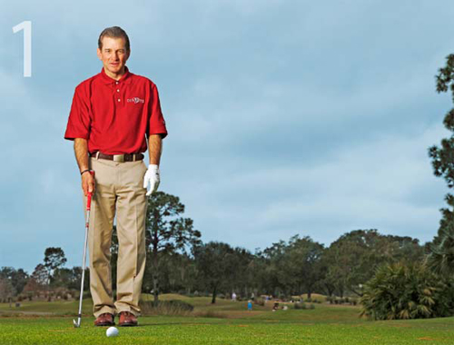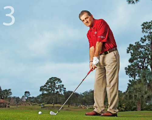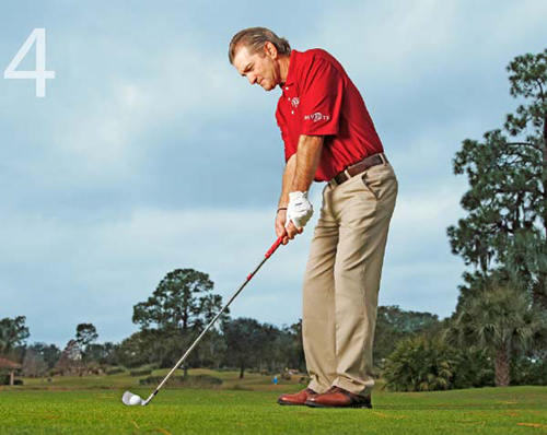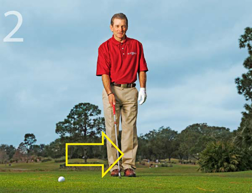 我会教给学员们一种包含4个步骤的击球前准备程序,帮助他们正确瞄准和校准。这种简单的程序将会帮助你在每次击球时使杆面与目标方向线保持垂直,使你的身体与目标方向线平行。
