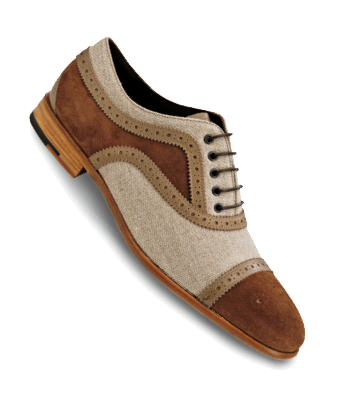 采用麂皮、帆布、牛皮三种材质拼接,在拼接部分巧妙结合布洛克花纹,打造出经典布洛克鞋。