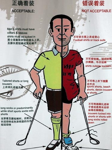 由于高尔夫在体育项目中的特殊地位,所以服装就不能视作一般的群众体育活动服装。例如做营销的人员,西装、领带、皮鞋是必然装束;劳动业工作者,自然穿着T恤、牛仔裤、安全鞋。那么打高尔夫的,当然应该尊重此项目,穿着合适的服装。