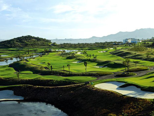 石岛湾球场设计结合了女性柔美之姿,绿茵球场与碧海青山浑然一体,球道设计融合自然地形起伏有致,果岭在碧水环绕之中,沙坑极富挑战性,球道堪称世界一流。