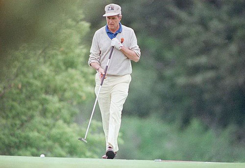 1989年7月1日,老布什在缅因州肯纳邦克港的阿伦德尔港高尔夫俱乐部拿着长推杆打球。