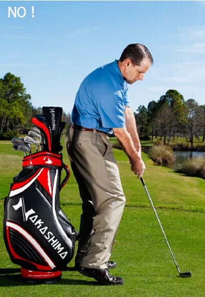 步骤1:使用铁杆,站位时臀部贴着球包。屈髋,使皮带扣朝向球。