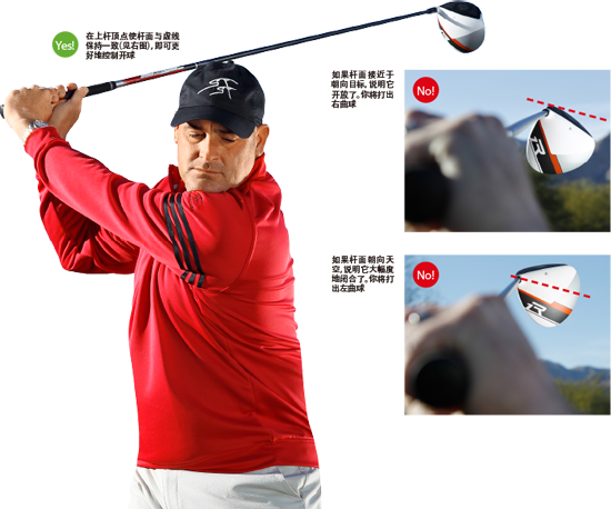 在挥杆顶点使杆面处于中立位置,告别右曲球和左曲球