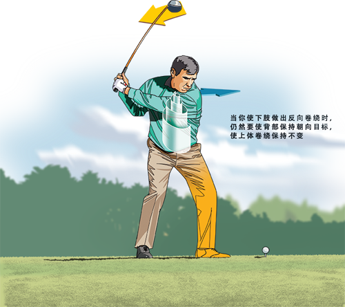 你的上杆要慢,要做到位,在上体和下肢之间制造对抗力。然后,当你启动下杆时,尽量长时间使上体卷绕保持不变。当你做出上下杆转换动作、使重心向着前脚移动时,应该感觉你的背部仍然朝向目标。将你的上体卷绕保持得更久一点,你的上体反向卷绕速度就会更快,从而提高杆头速度和挥杆力量。(来源:高尔夫杂志)