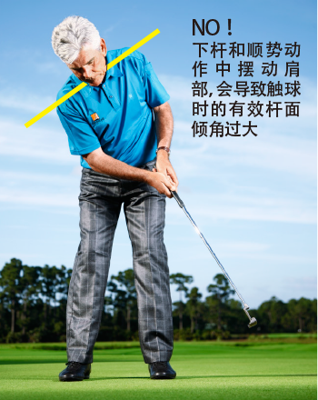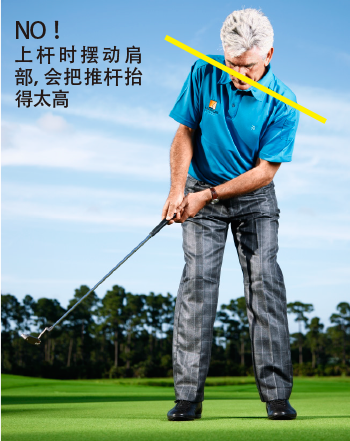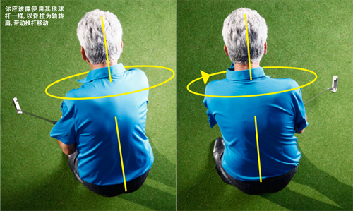 上杆时,感觉你的右肩好像在向着左肩稍偏后方移动。这会使得推杆沿着理想的弧线远离球。结束上杆之后,采用相反的动作:转肩,收杆时使左肩处于右肩稍偏后方。这会使得推杆在下杆时沿着弧线移动,触球后向目标内侧移动,确保触球时制造出合适的有效杆面倾角。