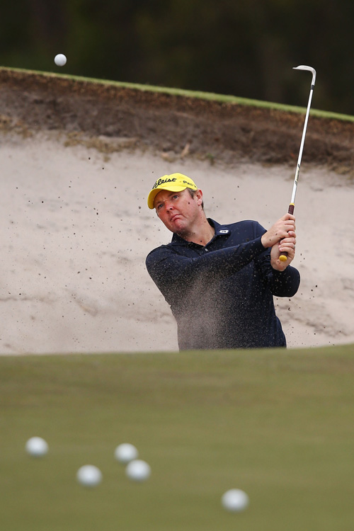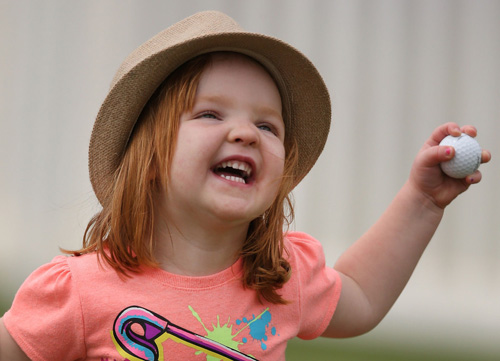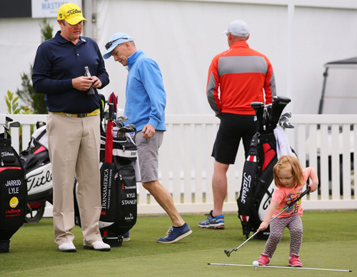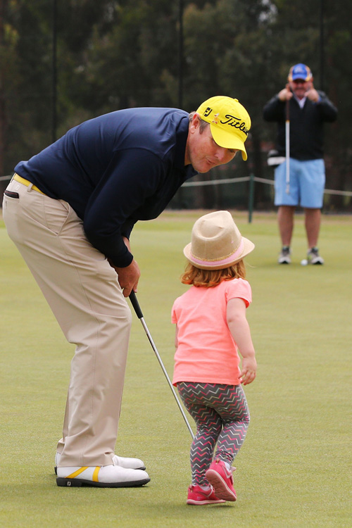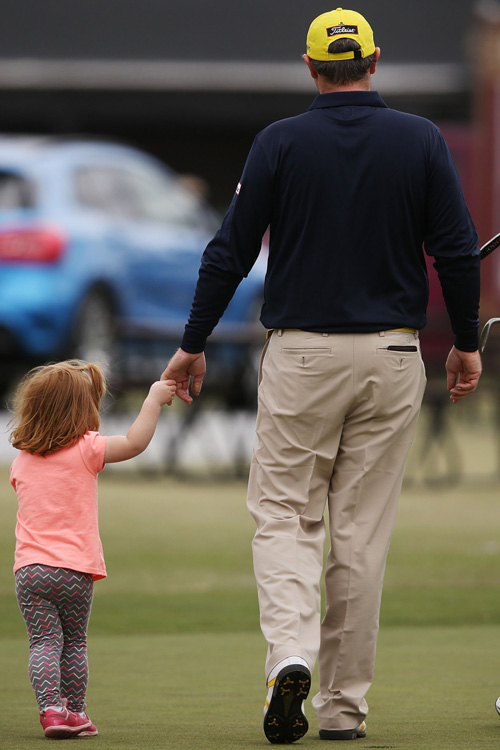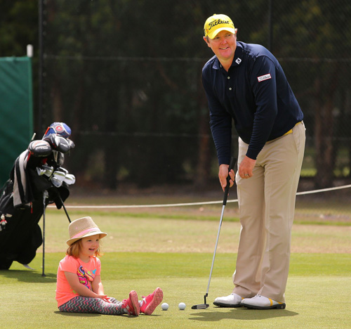 2014年澳大利亚高尔夫球大师赛即将在墨尔本的大都会高尔夫俱乐部(metropolitan)举行,周二球员下场热身,澳洲选手莱尔带着女儿出现在推杆果岭区域。