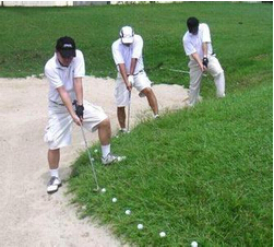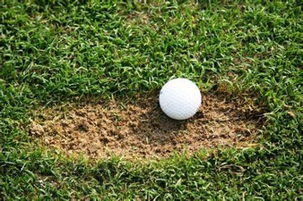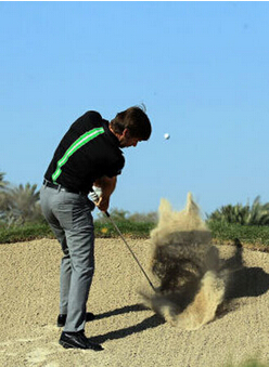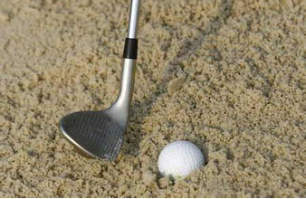 它被称为”煎蛋”,或者”埋藏的宝藏”,它能够困扰不同水平的球手。但是,被埋在果岭边沙坑里的球不一定总是很难打的球。你的做法应该是:在沙坑里做好正常的站位,关闭S杆杆面让其稍微瞄向左边,而且尽可能地将大量沙打出沙坑。但你不要期待球着陆果岭后一定会有旋转,这时你要为自己实现了第一个目标——“将球打出了沙坑”而感到骄傲。