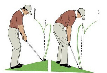 准备好出现会左曲的球路,就像球低脚高时球路是右曲的情况。弥补方案:向右瞄球,然后期待球能左曲,握杆时稍握高些,然后把重心放在前脚掌部分。这样有助于你在挥杆过程中保持平衡。
