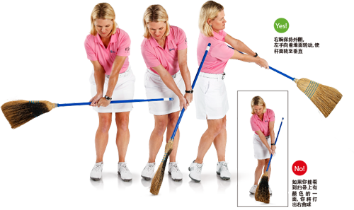 准备好用两件家用工具纠正右曲球了吗?拿一把扫帚,把一面喷上颜色。把扫帚看成是一支铁杆,站位,让有颜色的那一面朝向目标,练习挥杆。你的首要目标是在下杆时使右腕保持外翻,在还原动作中避免扫帚柄打到躯干左侧。这样能够避免过早伸直双腕,或者“抛掷”球杆。接下来,面对镜子挥杆,每次在触球时停住。如果你在触球时从镜中能看到有颜色的一面,说明你未能使杆面转至垂直。再次尝试,但这一次要使左腕内翻,使得触球前左腕外侧朝向地面。关键在于,转动左手的同时,要使右腕保持外翻。不要试图利用右手将杆面转至垂直!这会加剧抛掷球杆的问题,使你的挥杆弧最低点移至球后方远端。如果你在镜中只能看到扫帚的侧边,杆身向着目标倾斜,说明你的动作正确。(来源:《高尔夫》杂志)
