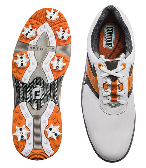 新款的Contour有10种颜色选择,有两年的防水保证,通过更薄的皮革鞋面使鞋的透气性更强。鞋底的前脚掌和后脚跟之间有热塑性塑料(thermoplastic)连接,从而增强稳定性和支撑。同时,新款Contour的泡沫鞋底夹层要比老款的轻。Contour有强调舒适性和合脚性的传统,FJ称Contour的鞋底适合数千种脚型。(来源:新京报高尔夫)