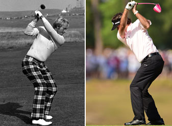 当我在哥伦比亚广播公司体育台报道纪念高球赛期间做这样的对比时,有一部分人表示怀疑。我们翻转了一幅尼克劳斯的挥杆照片,使他看上去像是左手执杆,从画面中看出两位球手都是自下而上地产生惊人的力量,同时伴随大幅度转身。