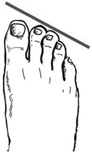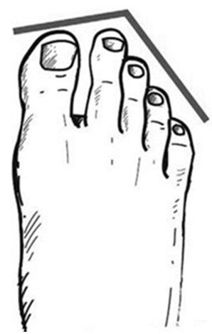 亚洲型:亚洲人多数是这种脚型。特征是大拇趾明显比其他四趾长,脚背较宽且高耸,脚跟不够圆。这类人选鞋时要特别注意足跟部是否合脚,否则脚跟容易从鞋里滑脱。