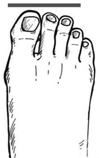 四角型:65岁以上的老年人多见该种脚型。特征是大拇趾到中趾几乎一样长,脚趾较粗壮,穿鞋时小脚趾容易受压迫。这种类型的人选鞋时要尤其注意足尖部不能过窄,否则容易挤伤脚趾。