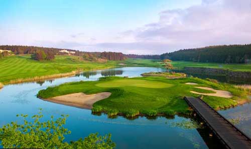 当东方遇见西方(Where East Meets West) ——这是韩国九桥高尔夫俱乐部的标语。作为21世纪的现代摩登高尔夫球场,很明显他们在极力表现东西方文化的融合,并以此为特色来吸引眼球。位于济洲岛上的九桥,总斥资一亿美元,工程之浩大奢华,难怪波多黎各的球员凯凯罗德里兹称它为高尔夫太姬陵。九桥球场为18洞,分高地9洞和湾地9洞,其中第7洞,第14洞和第15洞都设置了跨度极大的水障,是球场设计的一大亮点。