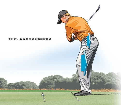 上杆时,你的双臂和球杆先移动,然后是你的肩部和髋部。下杆时,顺序相反:以下肢引导,上体随之移动。你的双腿和髋部应该先向侧面、向着目标移动,然后双臂和肩部才开始向下移动。这会使挥杆弧最低点前移,使你做出向下的击打,实现纯粹触球。