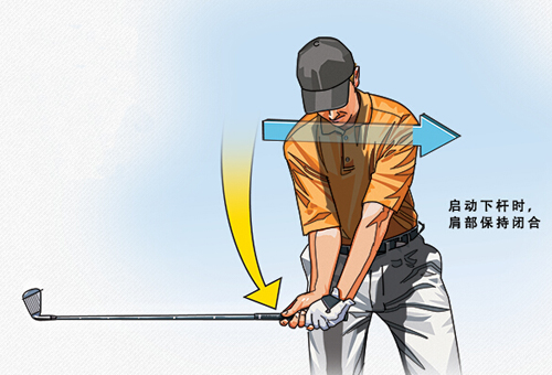 当双臂和球杆自顶点下落时,你的肩部不能转动,应该保持在与站位时相同的平面上。确保肩部稍微闭合,指向目标右侧。这会使球杆沿着正确轨迹移动。如果你用力向下拉动球杆,而不是让球杆随着重力下落,你的右肩就会张开,导致过陡的、自外向内的挥杆轨迹。
