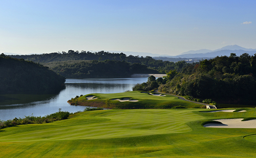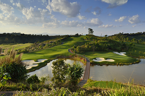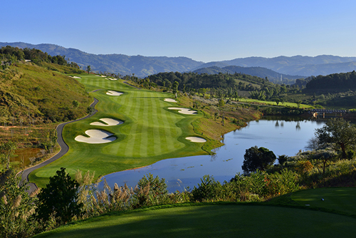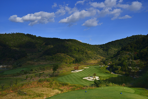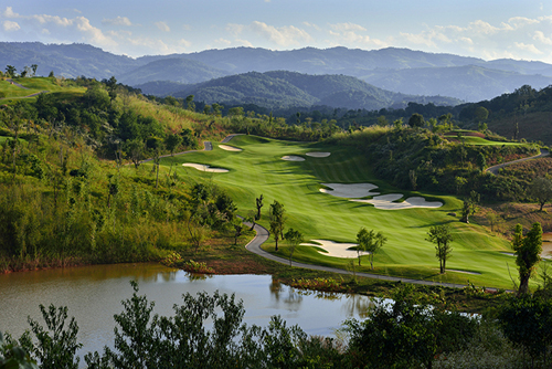 勐巴拉球场建在一片茂密山林围绕的山谷之中,前后9洞按照东西向布局,各自折叠环绕迂回至会所。这座全长7414码、标准杆72的球场给人的整体感觉是:景观大气,难度适中,趣味性十足。