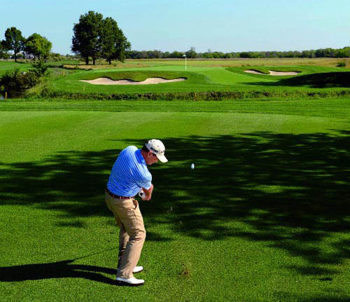 在美巡赛上,我经常会在进攻果岭时,故意不放上果岭,因为简单的切击球要比果岭上位置不好的推杆更容易处理。很多时候冒险获得的收益不见得值得。