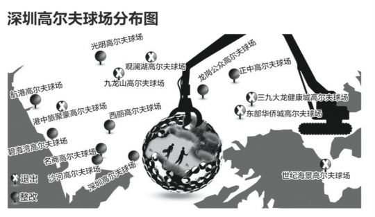 深圳现有15家高尔夫球场全部被纳入国家清查范围。其中,6家球场面临整治措施是“退出”(全省有8家高尔夫球场“退出”):观澜湖高尔夫球场、东部华侨城高尔夫球场、三九大龙健康城高尔夫球场、九龙山高尔夫球场、世纪海景高尔夫球场和港中旅聚豪高尔夫球场。据悉,这6家球场均涉及占用水源保护区问题。