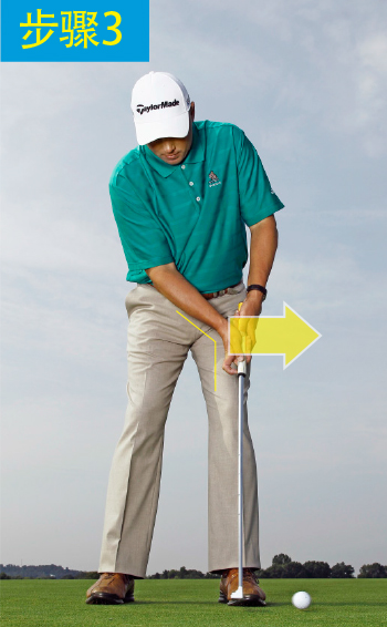 2.双手向前按压,使杆身稍微向着目标倾斜。这会使你的右腕向后弯曲,使双手锁定,避免杆面开放、闭合。它还能使你的右掌朝向目标。