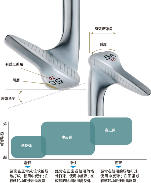 杆头底部的反弹角防止杆头挖地过深,允许杆头顺畅地通过草地和沙子,同时帮助球手在各种场合都能打出应有的击球效果。