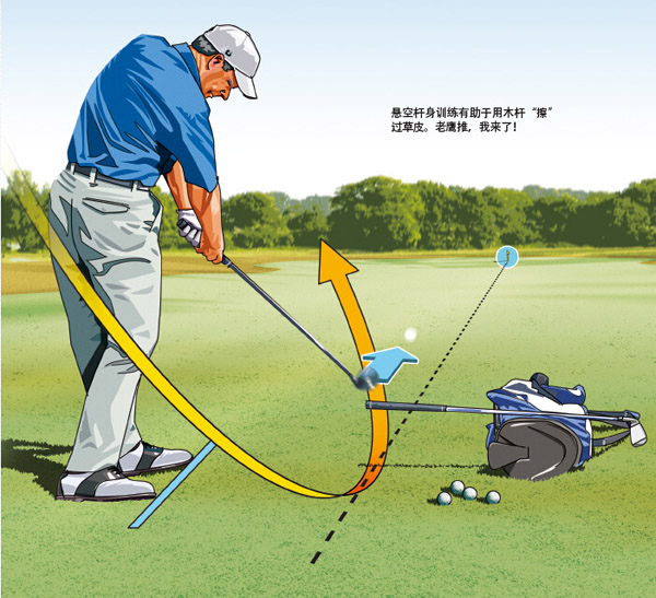 两杆攻上五杆洞果岭有一个非常关键的要点:你必须对球道木打出的距离锱铢必较。要做到这一点,将球“平扫”离地十分重要,这样杆头底部仅仅擦过草皮。这会显示球杆真正的杆面倾角,使球的飞行和距离最大化。 要练习用木杆“平扫”过球的动作,将球包平行于目标线放倒,拿一支球杆横放在球包上,让握把端直接悬在目标线上方。采取预备站位,将球置于悬空的杆身后侧12英寸处然后挥杆,在握把下方沿目标线加速挥动杆头。试击几次。通过彻底避开悬空的握把进入随挥送杆,你将确保自己在触球过程中正确地给杆头施力,很快你就能击中更多的果岭。(来源:《高尔夫》杂志)