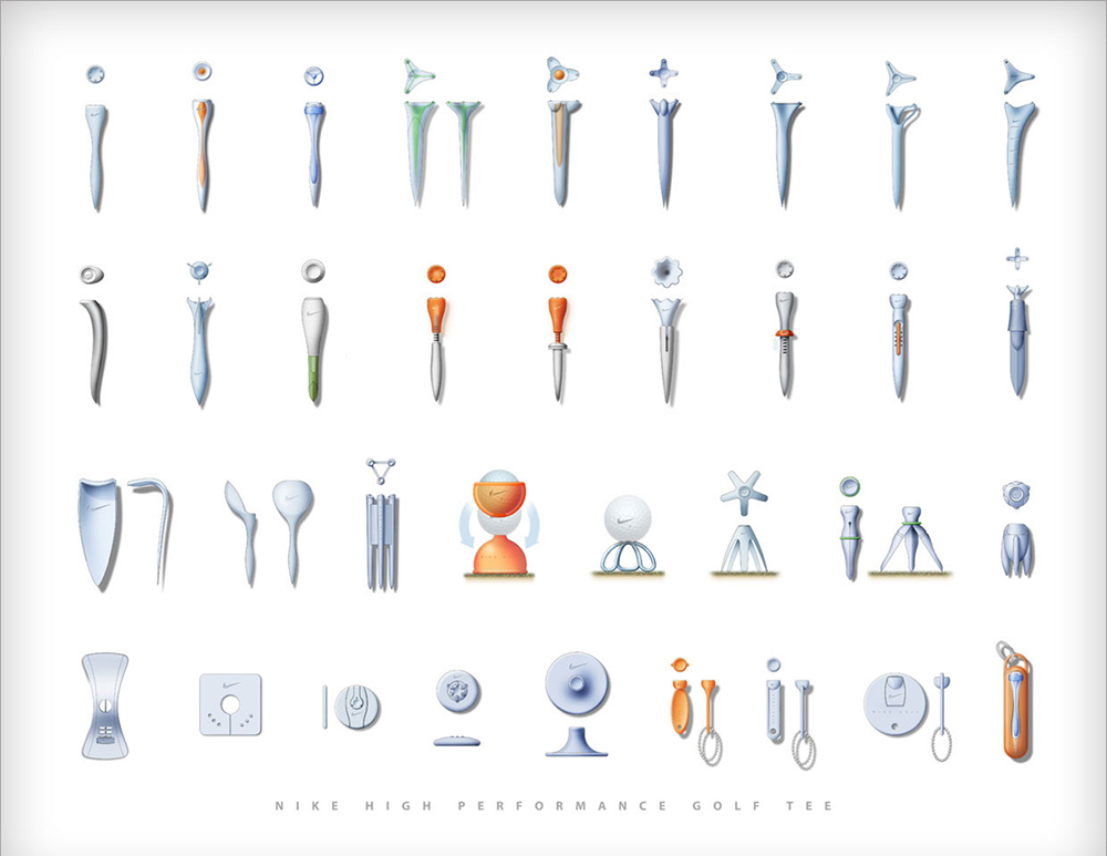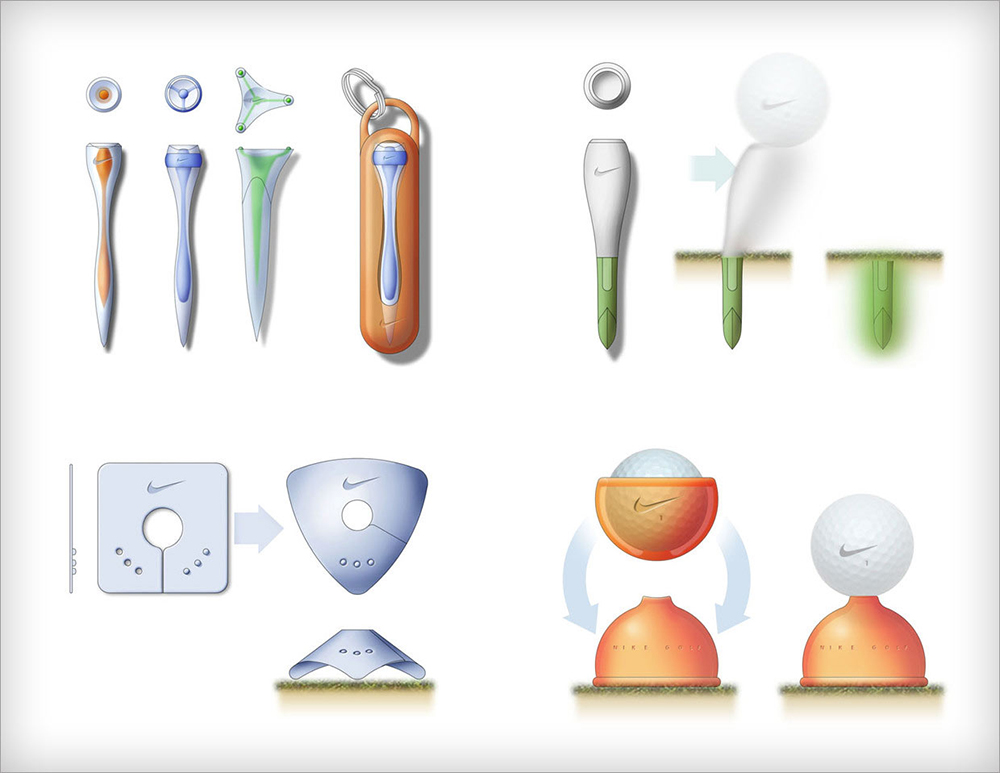“我们努力的目标之一:重新设计高尔夫球梯,增加了的球梯高度更好的适应耐克新型大杆头一号木。我们分析了目前的球梯,包括动态原理,瞄球和其他的技术性因素。同时还征询了目标客户的意见,例如便携性、性能等。我们设计出了33个概念产品,这些极具个性的产品符合耐克的创新要求,同时还能提升运动员的击球表现。耐克目前已开始对其中的四款设计展开批量生产评估。”—Altitude Inc.