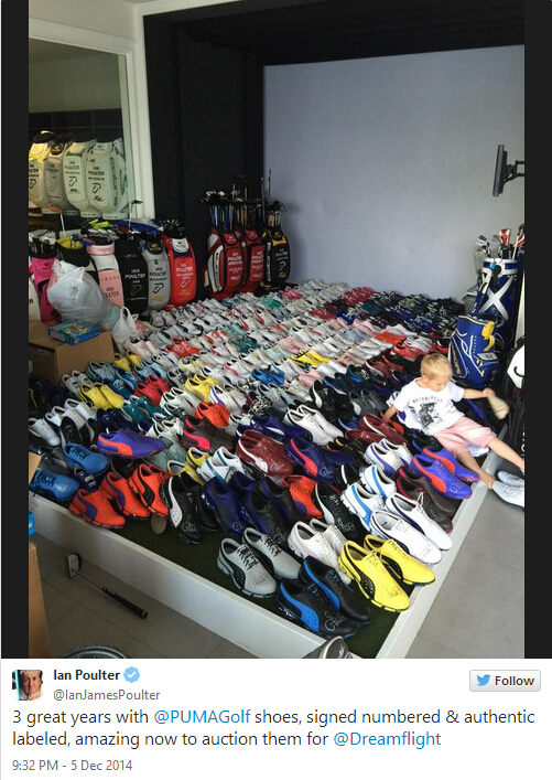 “与@PUMAGolf球鞋度过了3年好时光,已经编了号&贴了标签,为了@Dreamflight现在要拍卖。”Dreamflight是英国一家儿童慈善机构,每年都会带一些身患重病或者残疾的儿童去旅行。