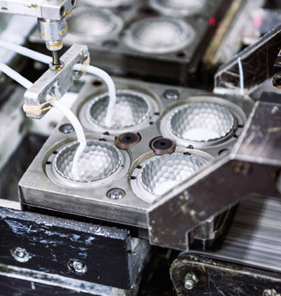 往模具里注入聚氨酯材料,准备制作高尔夫球的外壳