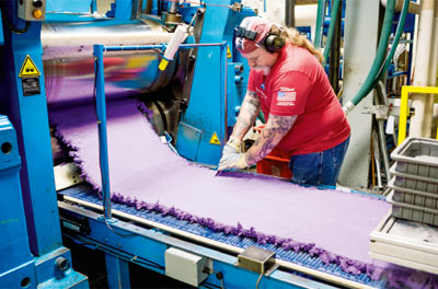 第二长的诺曼-曼德维勒(Norman Mandeville)只比他晚一个月入职。生产线的起点在三楼的原物料混合区。多种粉状的原材料按照一定比例从巨型漏斗注入,到二楼后和胶装材料一起加热,胶状材料对高尔夫球的弹性帮助大。经过机器的层层处理,到一楼时,原材料已经变成了一张张类似于地毯的合成橡胶材料,我好奇地摸了一下,热得烫手。“橡胶地毯”加入了不同的颜料,以区分材质来制作不同产品的内核,譬如ProV1的球核是湖蓝色,Pro V1x的双球核则分别是粉色和紫色。接下来的过程有点儿像烘焙蛋糕。所有通过重量、密度、弹性检测的橡胶块被切割成一个个小小的圆柱体送入模压机,在高温高压下形成初始的球核。不合格的橡胶块也不会浪费,重新融合后再检测。为了保证同款高尔夫球性能的稳定,先进的模压机让每一款球核在压制时承受的温度和压力尽可能一致。