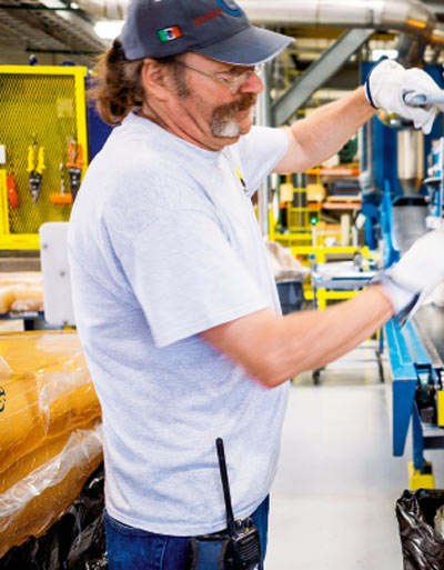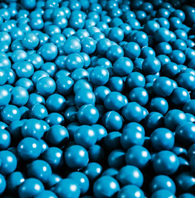 橡胶块被切割成一个个圆柱体,准备送入模压机形成初始的球核