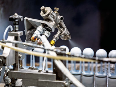 外壳被打磨光滑后,高尔夫球的颜色略显发暗,此时就要上漆了。小喷头均匀地喷上一层白漆,然后开始印制Logo、球号和瞄准线,接下来再喷第二道透明漆。透明漆不仅让高尔夫球看上去亮晶晶的,还使它更加耐用,有助于减少划伤。