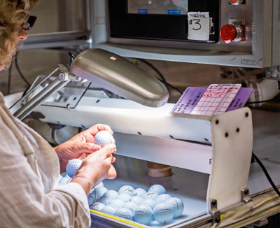 这时,我们在市场上能买到的高尔夫球就制作完成了。Pro V1有31道制作程序,Pro V1x是46道,若要加上质检程序,Pro V1出厂前的工序多达91道,Pro V1x更是达到了120道。X光检测是生产Titleist高尔夫球过程中一道标志性工序,以确保每一颗球和它们的球核都是正圆形。