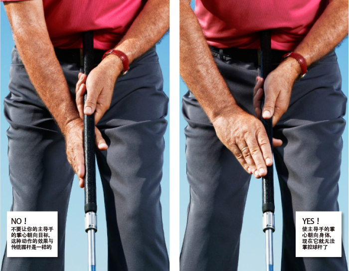正确的动作应该是使右手掌心朝向身体,而不是目标(见上右图)。这样能够防止你以主导手控制击球,让前手对击球施加更多的影响。(来源:《高尔夫》杂志)
