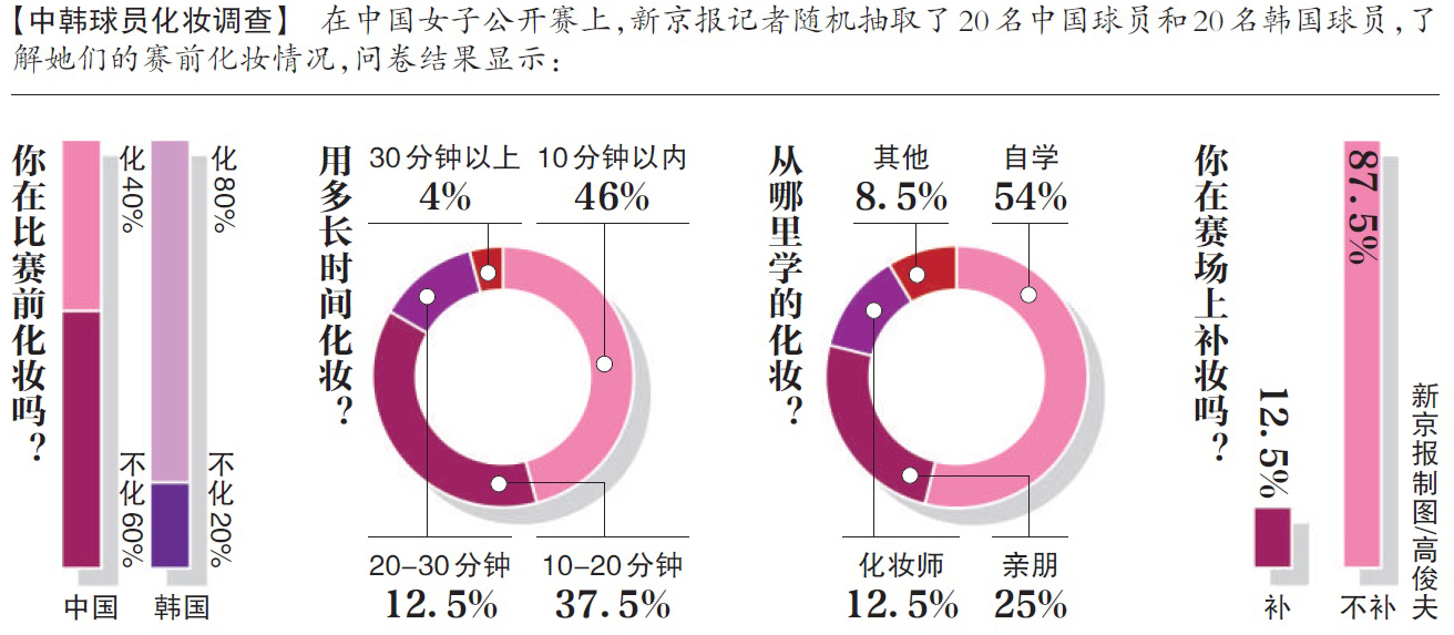“韩国球员出来都很漂亮。有些即使底子差,妆化得也很美。”每年的两场中韩女子巡回赛上,韩国球员的魔力妆容总是让中国观众念念不忘。