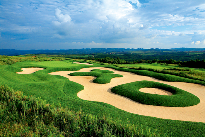 设计师在156码的三杆洞第8洞融入了中国文化的元素。果岭前的长草和沙坑交叉的障碍区构成了一个吉祥的吉字,当然,如果你从球道左侧望去,它还有些像英文字母XO,无论如何,它增添了打球的乐趣。