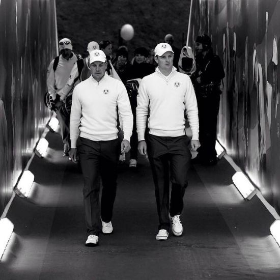 6.贾斯丁-罗斯和亨里克-斯滕森并肩走进赛场,参加莱德杯的双人比赛。双雄并立,灰白的色调仿佛在揭示这大战前夕那中一触即发的紧张气氛,相比彩色照片来说,黑白更容易让人体味照片里流露出的心情。