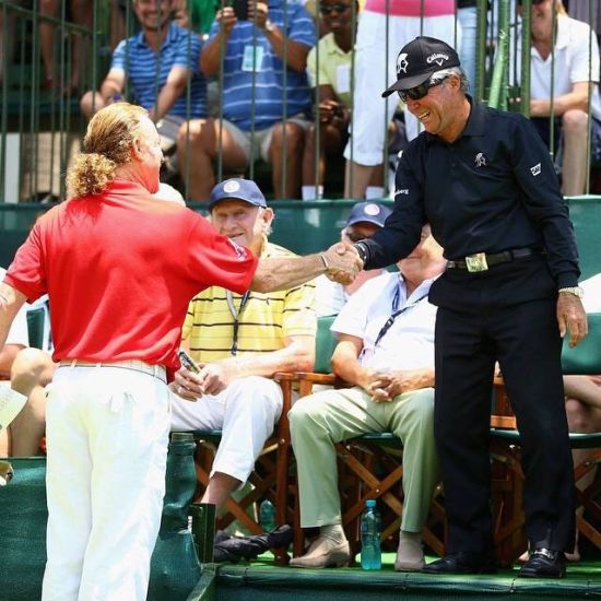 7.这是两位传奇之间的握手, 西蒙尼斯(左)和普莱耶。仿佛是一种志同道合的认可,老当益壮仍旧征战沙场,这是一种高尔夫无畏的精神,更是一种一往无前的气势。