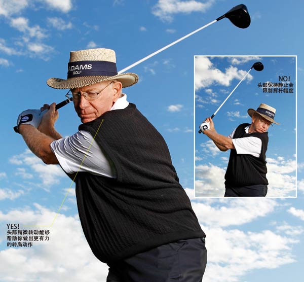 你本来有机会做出正确的肩部动作,但由于你坚信一条古老的建议——使头部保持静止,这导致你无法自然转肩。头颈保持不动会减小上体转动幅度。如果你让头部随着上体而转动,就能够增加转体和卷绕幅度。