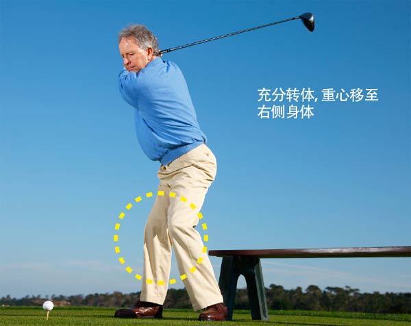 步骤1:将一条长凳或一把椅子放在左侧臀部后方,挥杆。在上杆顶点,确保双膝弯曲(尤其是右膝),髋部相对于目标方向线大幅度闭合。这就是储存能量所需的卷绕动作。