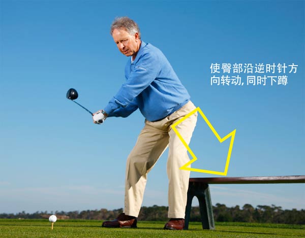 步骤2:下杆时,加大屈膝幅度,同时使下肢向着目标转动,感觉你正要坐上身后的长凳或椅子。如果你的动作正确,你会发现触球变得更加有力了。(来源:《高尔夫》杂志)