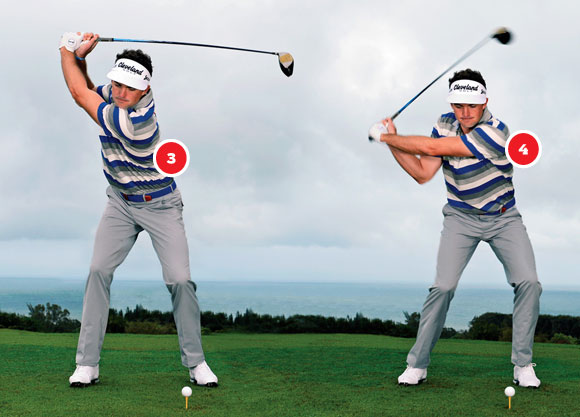 基根-布拉德利:尽管通常我不会考虑顶点的姿势,但是我会时刻提醒自己上杆不能过快。我希望身体各个部位能够协调一致。尽管这个位置会感到身体完全被拉紧,但绝不是紧张。我认为最关键的是手臂保持放松。