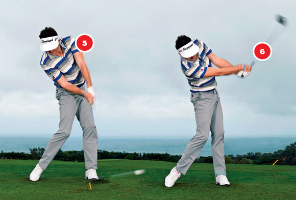 基根-布拉德利:谈到启动下杆,我首先会将身体重心朝目标方向转移。而此时手臂事实上还在继续完成上杆的动作。因此会在接下来的下杆过程中形成杆头滞后的效果,杆头速度正是源于此。