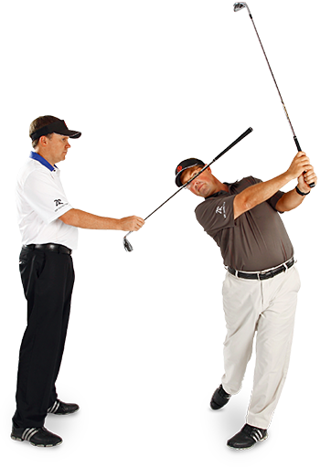 要找到正确的感觉,可以尝试一下这种简单的训练法:站位,请一位朋友拿一支铁杆,让杆身与你向下看球的视线平行。练习挥杆,收杆时使双眼仍然与杆身保持在同样的平面上。如果你的做法正确,在通过击打区时,你的脊柱将向右弯曲,这会使得球杆保持沿着目标方向线移动。