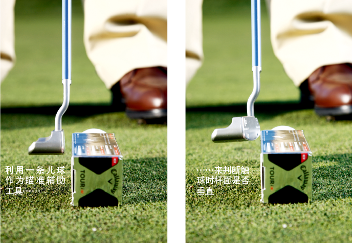 将一条儿球放在小白球旁边,站位时使杆面处于垂直状态后,就可以开始练习在击球时使杆面保持垂直状态了。如图所示,在小白球外侧摆一条儿球,短边靠近球,站位,击球。利用盒子的长边帮助检查杆面有没有开放或闭合。