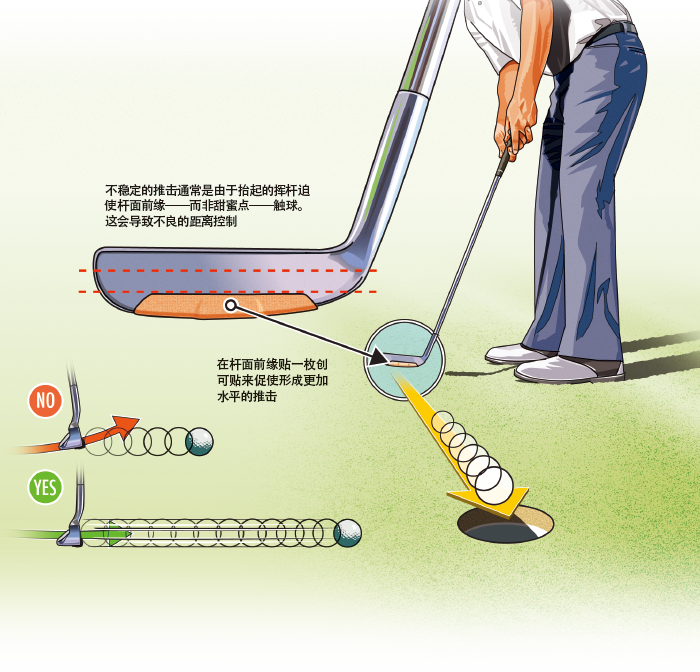 如果这听起来似曾相识,很有可能是你在触球的过程中向上翻球杆,用杆面的下半部触球,这种错误可能同时带来距离和方向上的问题。要修正它,在杆面下部三分之一处贴一枚创可贴,创可贴的上沿刚好在甜蜜点之下。然后做几次推击练习,避免让球碰到创可贴。这会强制球杆在触球过程中保持水平,用杆面更靠上的部位触球,结果是从甜蜜点推出更加纯粹、稳定的推击。(来源:《高尔夫》杂志)