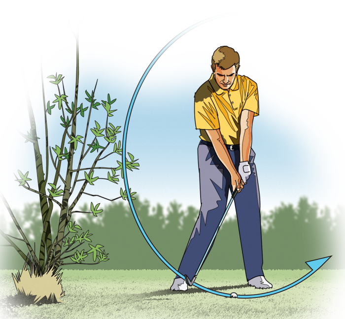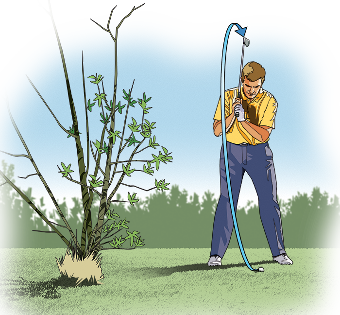 你的开球停在了距离一棵树几英尺处,导致你无法做出标准上杆。最安全的打法是利用砸击先把球打回球道上,但球前方没有障碍物,你完全可以积极进攻,而且你已经无法承受又一次博基了。下次当你陷入这种困境时(无论障碍物是树、灌木丛、篱笆,还是其他物体),可以尝试一下百佳教练曼纽尔·德拉托尔介绍的这种无上杆打法。
