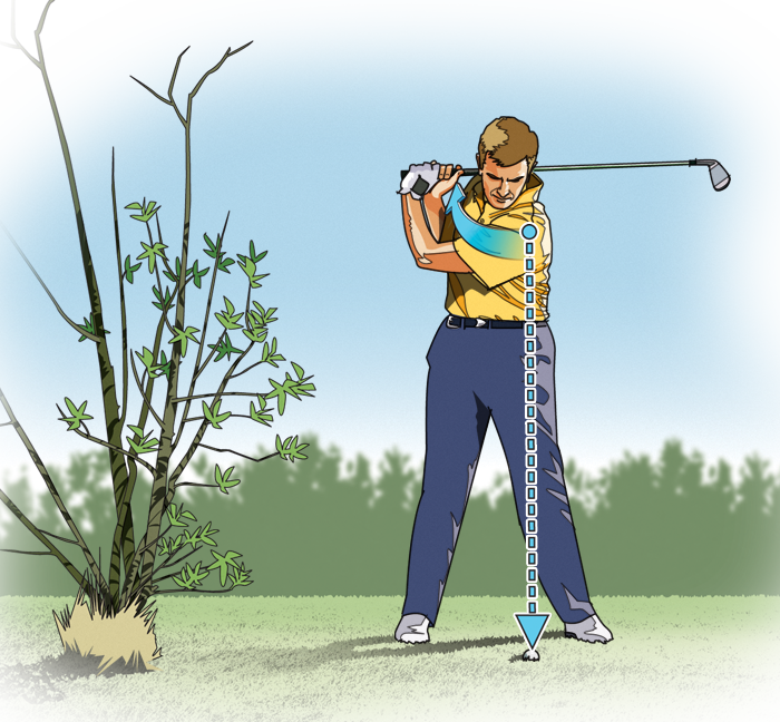 做出标准下杆、触球动作。不要有意加快下杆速度,下杆要流畅。由于你的下杆弧明显比上杆弧要窄,你将会避开身后的障碍物,实现稳固触球。(来源:《高尔夫》杂志)