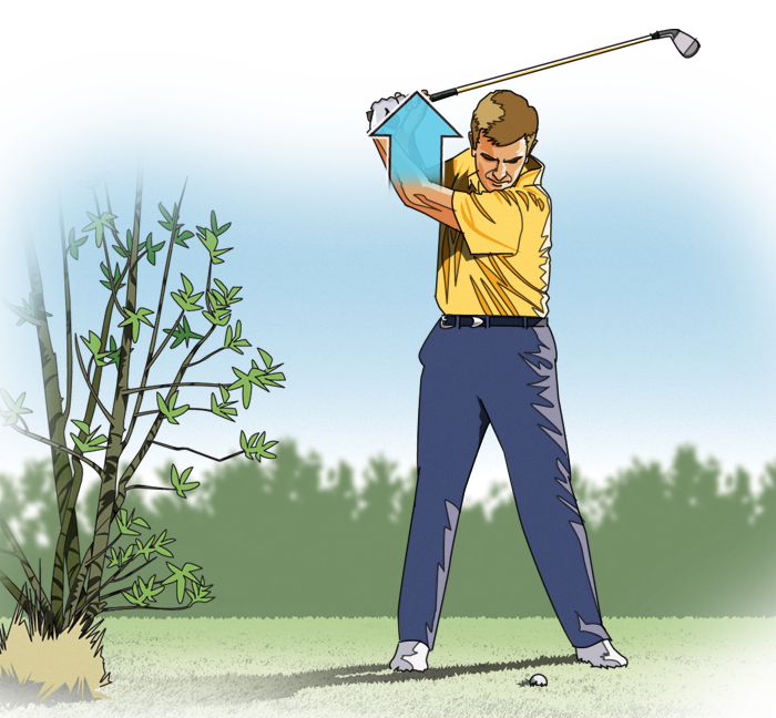 使用比以往大一号的球杆,因为你无法像全挥杆时制造出那样高的杆头速度。摆出标准站位,笔直抬高球杆,将杆身靠在右肩上。这种简单的动作取代了上杆,消除了球杆碰到树干或树枝的可能性。